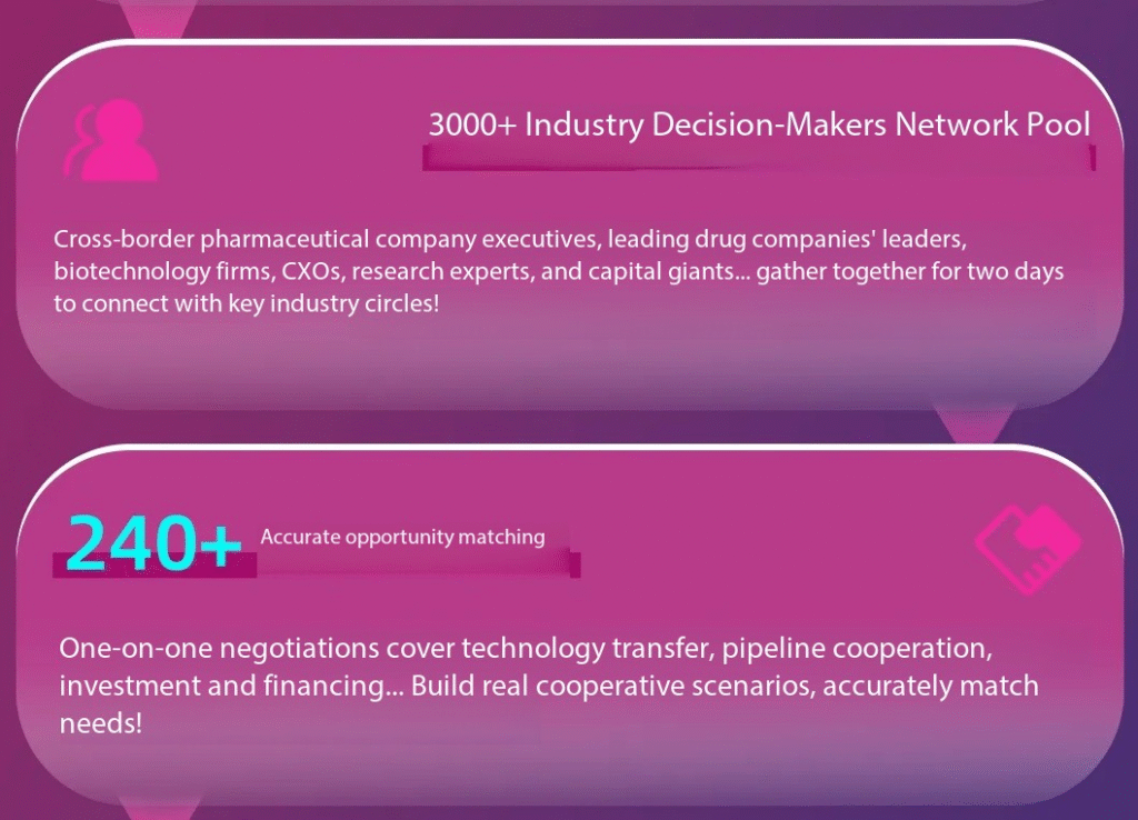 - Over 240 customized one-on-one negotiations will be conducted on-site, covering key areas such as technology transfer, pipeline collaboration, and investment and financing. This highly acclaimed signature service helps participating companies quickly identify the most valuable business partners, create real collaboration scenarios, and precisely match demand with supply.